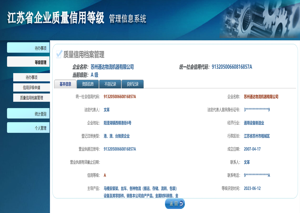 江蘇省企業(yè)質(zhì)量信用等級A級